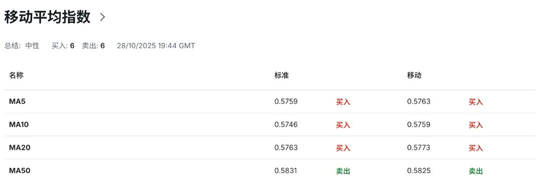 技术指标显示,日图级别上,布林带上轨当前收缩至0.5835附近区域,与50日均线形成粘合,二者共同构成纽币短期关键动态阻力。布林带中轨则维持于0.5760附近区域区域,为纽币短期价格走势提供多空力量以及强弱格局核心分化枢纽。而布林带下轨维持0.5680一线,为纽币当前价格走势提供动态支撑。布林带开口呈现收敛迹象,表明市场短期波动率将有所下降,汇价或偏向进入阶段性震荡整理格局。需要注意的是,纽币当前价格走势正位于布林带中轨附近区域试探,伴随14日RSI相对强弱指标回归至55-45强弱平衡区,反映多空力量当前维持相对均衡,汇价或将进入阶段性多空博弈临界面以及方向性选择临界点。与此同时,积极信号显示,RSI指数较前期低值有所回升,并已接近50中值水平,提示多头动能正在呈现缓慢修复迹象,短线技术性反弹条件以及纽币在经历超卖后的均值回归需求正在累积,如若纽币可在有效突破布林带中轨区域后逐步向上轨延伸,伴随RSI指数升破55-45强弱平衡区上沿临界点,则将提示多头动能复苏动力上升,为汇价短期进一步回升提供潜在技术空间。MACD显示DIFF-0.0023、DEA -0.0035、MACD柱状图维持负值区间与双线位于零轴下方但较此前有所缩量,显示空头量能收缩但并未能形成明显趋势性反转信号,若后续柱状图维持负值缩窄并出现零轴上方的回测,将有望触发真实技术性以及趋势性反弹的概率。